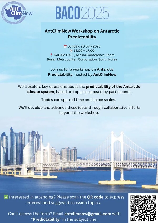 AntClimNow would like to invite you to participate in the upcoming AntClimNow Workshop on Antarctic Predictability, taking place on Sunday, 20 July 2025 (14:00–17:00) at the GARAM HALL, Arpina Conference Room, Busan, South Korea.