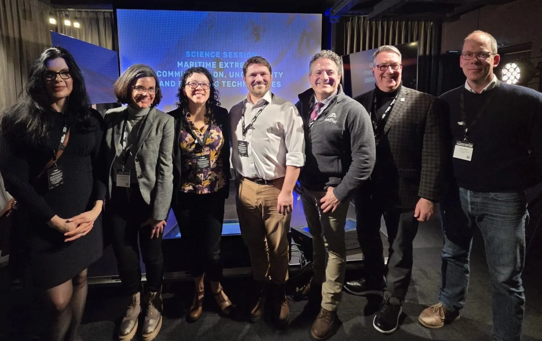 Co-chairs of the Maritime Extremes Arctic Frontiers 2026 Science Session with the presenters from the second sub-session focused on emerging technologies and user needs. From left to right: Irja Malmio (Swedish Defence University), Dina Abdel-Fattah (MET Norway), Penelope Wagner (MET Norway), Ed Blockley (UK MET Office), Jereme Altendorf (University of Alaska Anchorage), Benjamin Strong (Arctic Council), and Malte Müller (MET Norway). Photo courtesy of: Dina Abdel-Fattah