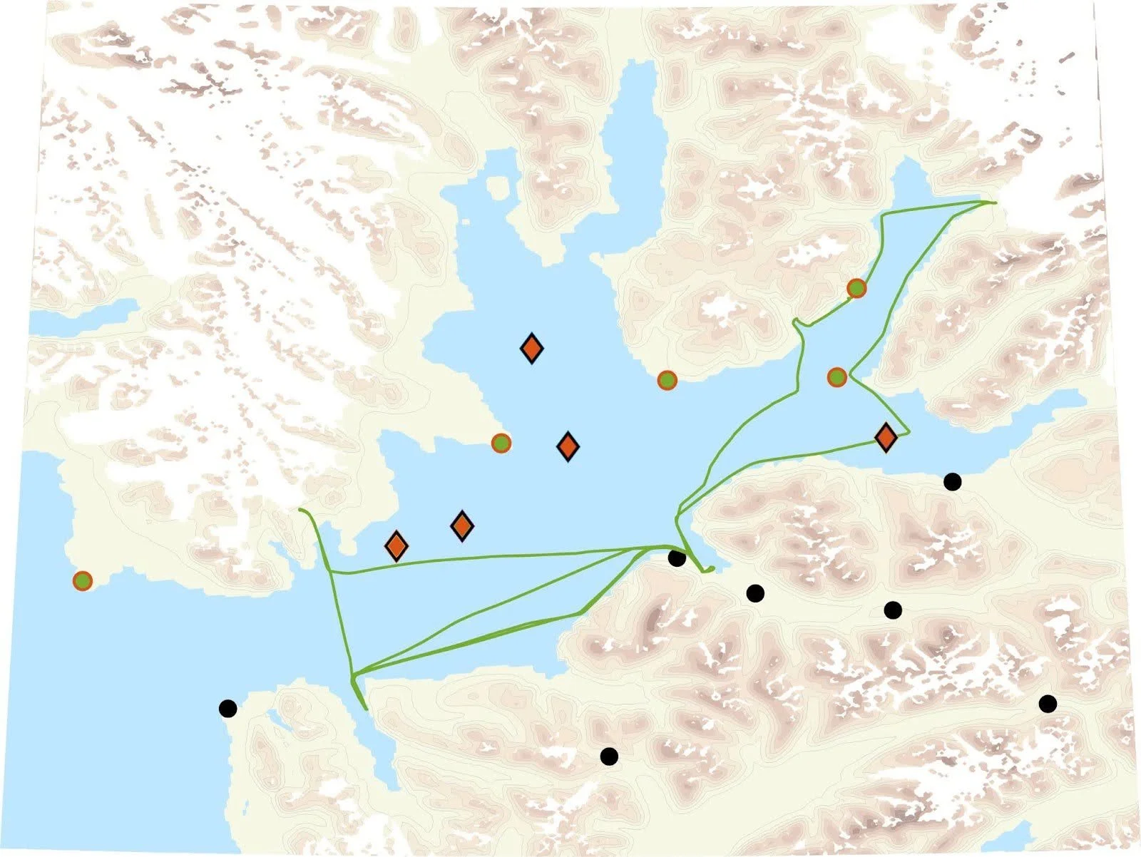 Map of the Isfjorden area showing the locations of existing weather stations from MET Norway (black dots), typical trajectories of ships with IWIN weather stations on them (solid, green lines), lighthouses with IWIN weather stations on them where infrared surface temperature sensors will be installed as part of the IWOOS project (green dots with red circles), as well as locations for new IWOOS ocean moorings (red diamonds).
